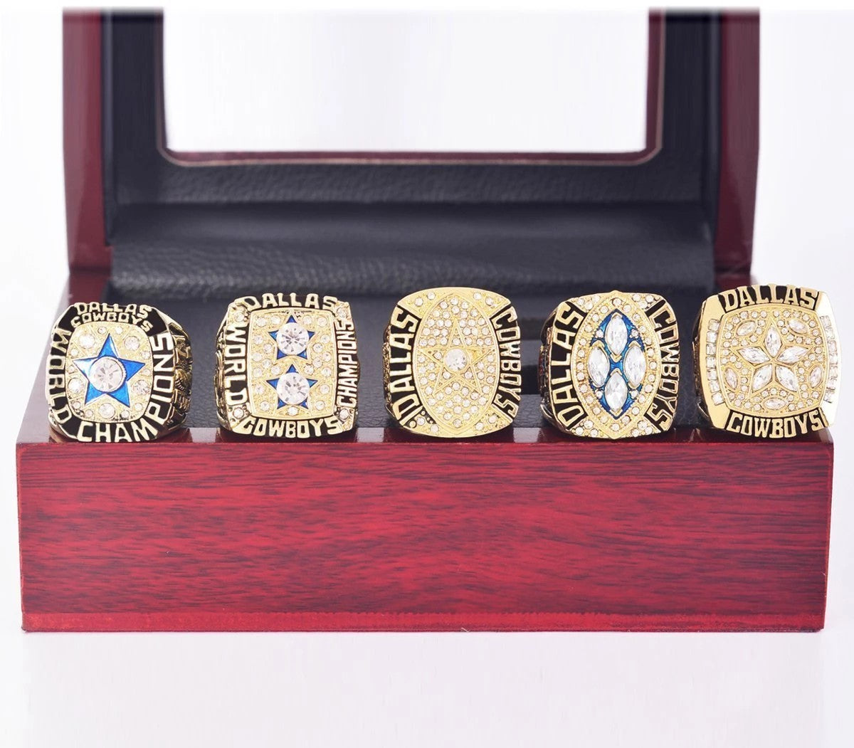 Team: Dallas CowboysYear: 1995Metal Type: Zinc AlloyMaterial: Cubic ZirconiaSize: 8 to14